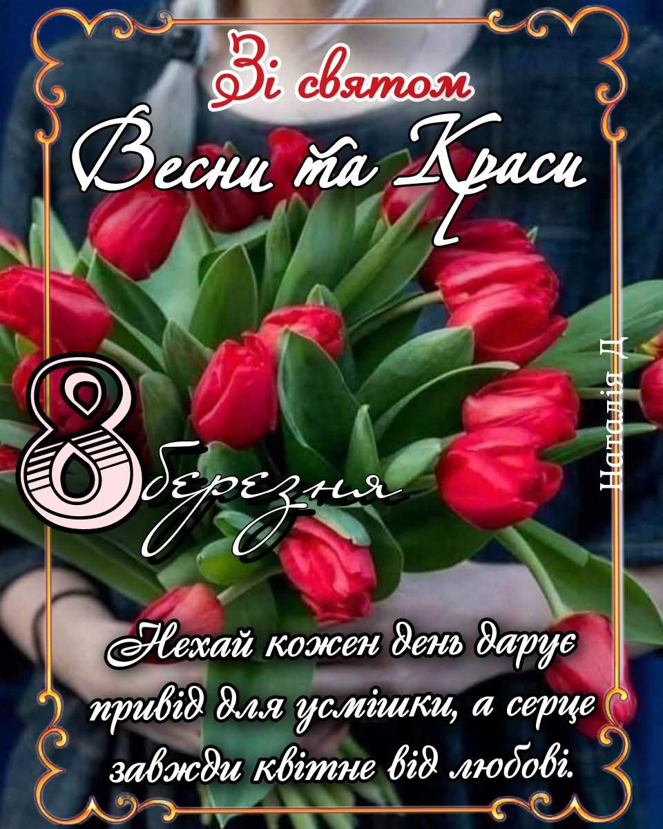 Дорогі наші дівчата, жінки, мами, бабусі, сестрички, колеги вітаємо Вас з Міжнародним жіночим днем. Бажаємо вам весняного настрою, гармонії в душі та багато щасливих моментів. Нехай у вашому житті завжди буде багато світла, тепла й радості. Бажаємо, щоб кожен день приносив нові можливості, щирі посмішки та приємні несподіванки. Нехай поруч будуть люди, які цінують, підтримують і надихають. Нехай у серці панує гармонія, а мрії впевнено стають реальністю. Миру у ваших родинах та нашій країні. Зі святом